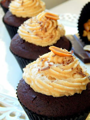 Beat the cream and add peanut butter and cream cheese. If needed add powdered sugar to taste. I put the cream immediately into a decorating bag and let in cool in the fridge for a few hours, so it would behave better when decorating. You can also just spoon on the cream. Use your imagination:) Go crazy:) I sprinkled them with a bit of grate chocolate and a few peanuts.